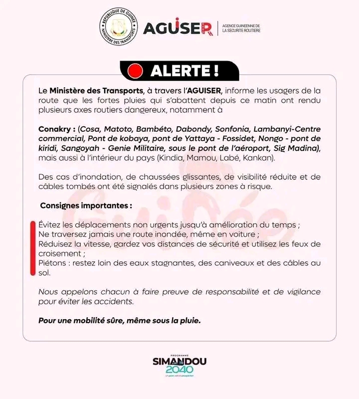 Des fortes précipitations ont été enregistrées dans la nuit du vendredi au samedi. Ceci a rendu dangereux plusieurs axes routiers de la capitale impraticables et dangereux. Le ministère des transports à travers l’agence guinéenne de la sécurité routière alerte les usagers et piétons à être prudents pour éviter les accidents de la circulation. (Voir la copie du communiqué ci-dessous).